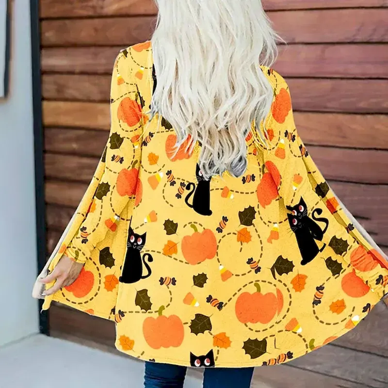 Specifications Gender:Women’sOuterwear Type:Casual JacketOccasion:Athleisure,Casual Daily,Casual,Daily,StreetSeason:FallFunction:Warm,Comfortable,BreathableFabric:PolyesterStyle:Comfortable,Elegant,Modern,Fashion,Casual,VintageOuterwear Length:LongPattern:Skull,PumpkinDesign:Open Front,Irregular HemNeckline:CollarlessDetails:Without LiningSleeve Length:Long SleeveFit Type:Regular FitElasticity:InelasticLook After Me:Machine wash,OK