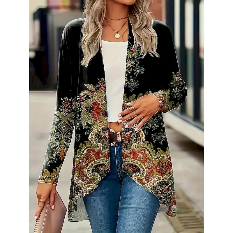 Women’s Casual Jacket Breathable Comfortable Patchwork Print Casual Floral Vacation Street Daily Wear Going out Open Front Regular Collarless Regular Fit 3/4 Length Sleeve Outerwear Black Green Dark