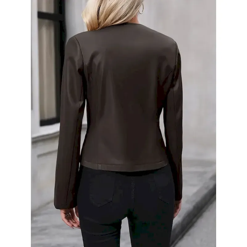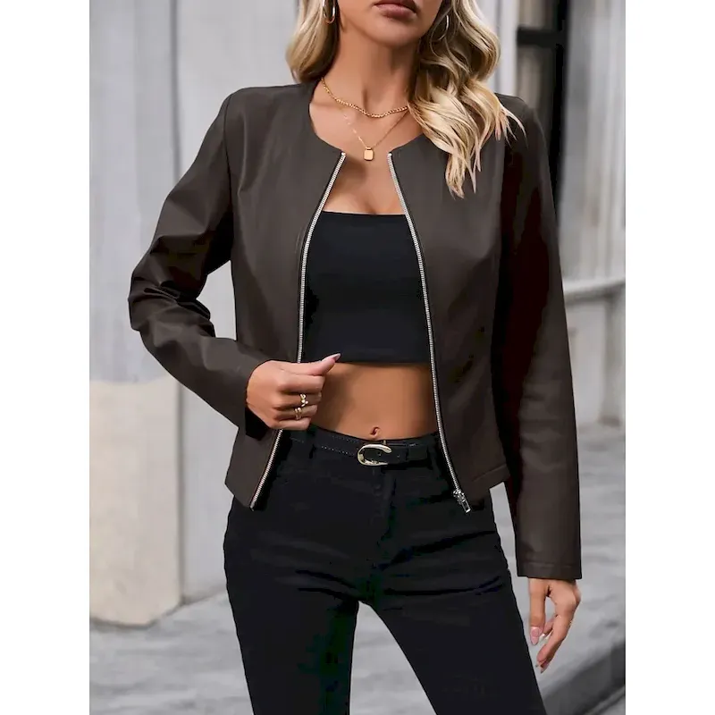Specifications Gender:Women’sOuterwear Type:Casual Jacket,Faux Leather JacketOccasion:Daily Wear,Vacation,Street,Casual,Going outSeason:Fall,SpringFunction:Breathable,ComfortableFabric:PolyesterPlacket:ZipperStyle:CasualOuterwear Length:ShortPattern:PlainDesign:ZipperNeckline:CrewneckSleeve Length:Long SleeveFit Type:Regular FitElasticity:Micro-elasticLook After Me:Machine wash,OK