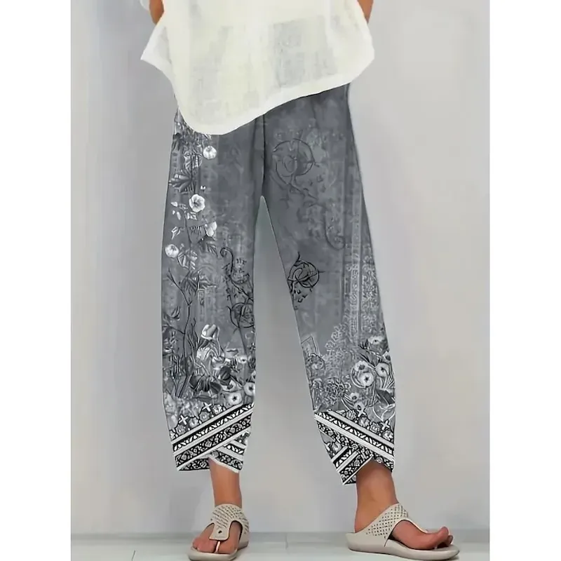 Women’s Wide Leg Chinos Baggy Pants Vacation Vintage Ethnic Style Ankle-Length High Waist Floral Graphic Printing Thermal Warm Soft Breathable Micro-elastic Vacation Street Causal Ash Violet Robin’s