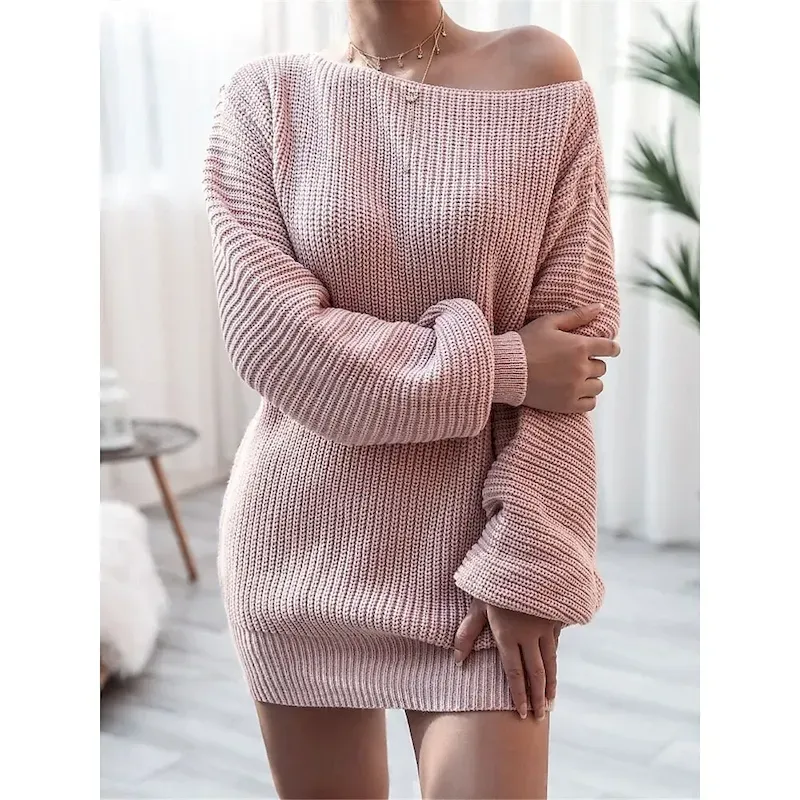 Women’s Sweater Sweater Dress Casual Soft Pure Color Ribbed Off Shoulder Knitted Long Sleeve Long Tops Knit Outdoor Daily Weekend White Pink Fall Winter