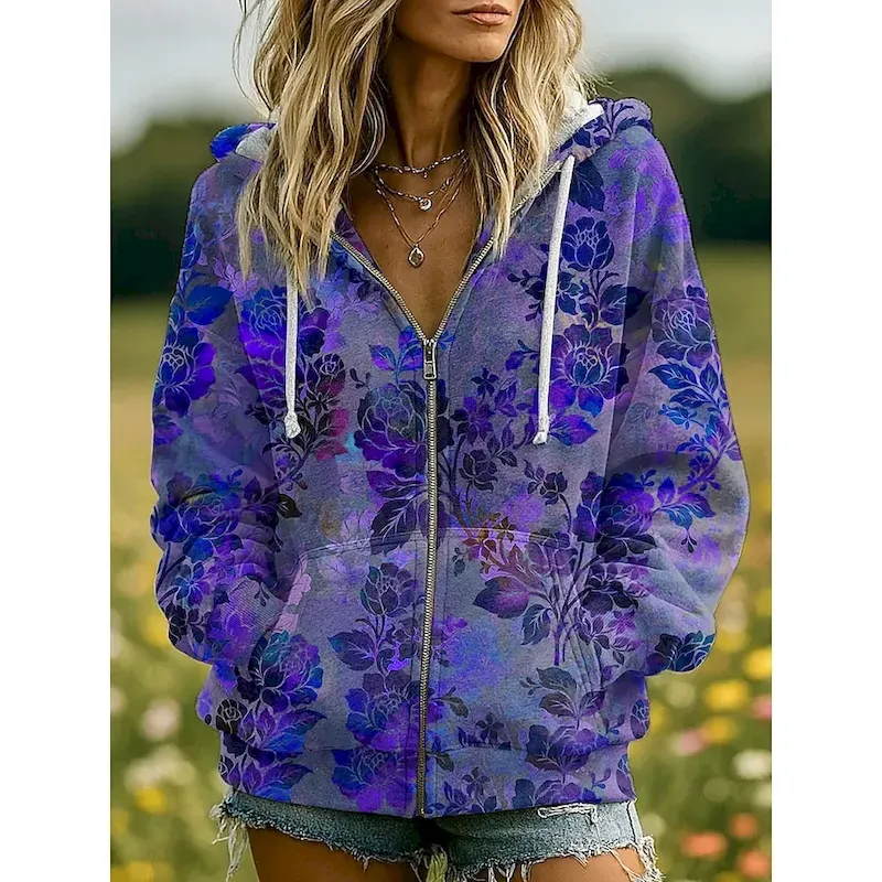 Women’s 3D Print Vintage Boho Hoodie Patchwork Hoodie Sweatshirt Floral Zip Up s Fashion Casual Long Sleeve Hooded Street Dailywear Patchwork Zipper Pocket Red Blue Purple Fuchsia Green Spring Fall