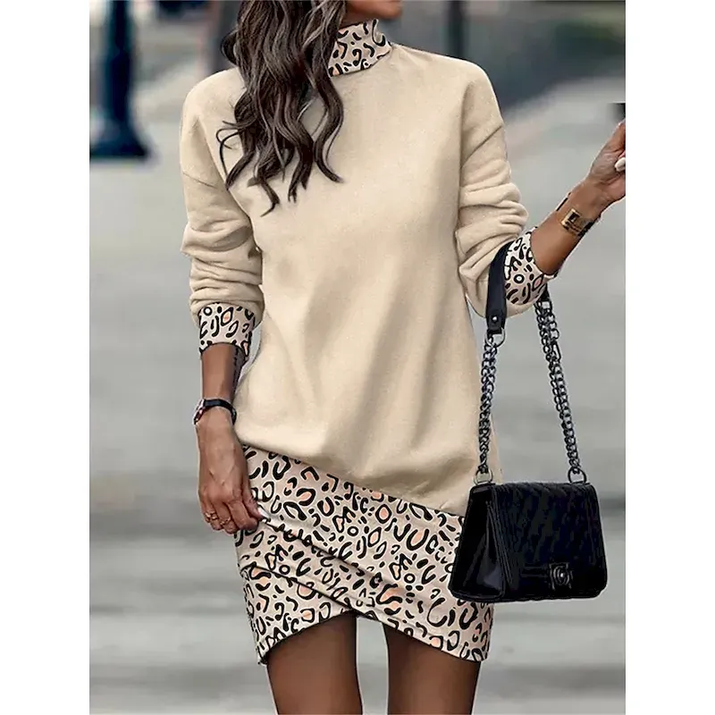 [Design Highlights] Featuring a stand collar and long sleeves, this dress is designed for both style and functionality. Its eye-catching color-block design in black and beige, along with an array of patterns including abstract, leopard, and floral prints, adds visual interest and makes it a standout piece.