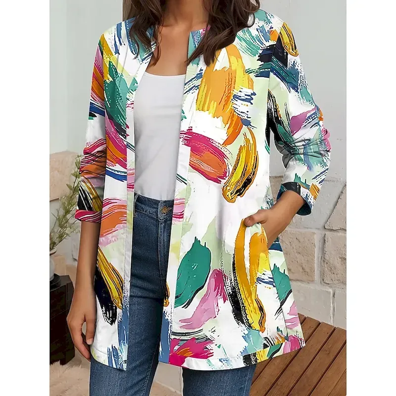Women’s Blazer Work Fall Winter Regular Coat Regular Fit Breathable Elegant Artistic Style Boho Vintage Jacket Long Sleeve Geometric Print Open Front Yellow Pink Blue
