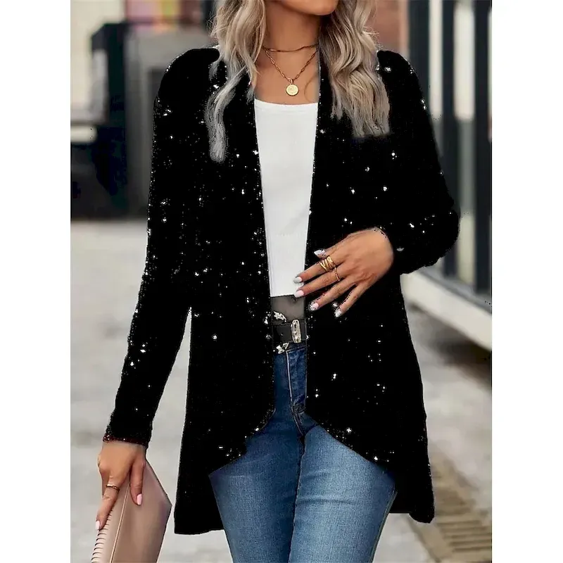 [Fabric] Crafted predominantly from polyester, this women’s casual jacket showcases micro-elasticity for a comfortable and breathable fit. The use of sequins throughout the fabric offers a glamorous and eye-catching appearance, ideal for those who want to stand out.[Fit] Designed with a regular fit, this jacket provides ease of movement and comfort. The long sleeves and regular outerwear length make it suitable for layering in cooler weather, ensuring thermal warmth during the fall and winter seasons.[Design Highlights] Featuring a collarless, open-front design, this jacket is easy to layer over various outfits. The draped silhouette and slightly asymmetric hem add a modern twist, making it both chic and contemporary. Available in vibrant color options including black, silver, and red, every piece features plain sequin embellishments that add a touch of sophistication and shine.[Occasions] Ideal for daily wear, street style, and outdoor activities during the fall and winter seasons. Whether attending an evening event or enjoying a casual day out, this jacket effortlessly elevates any ensemble with its stylish design and elegant flair.[Size Range] Available in a variety of sizes including S, M, L, XL, and 2XL, this jacket accommodates a range of body types, offering a comfortable and flattering fit for most women.OK
